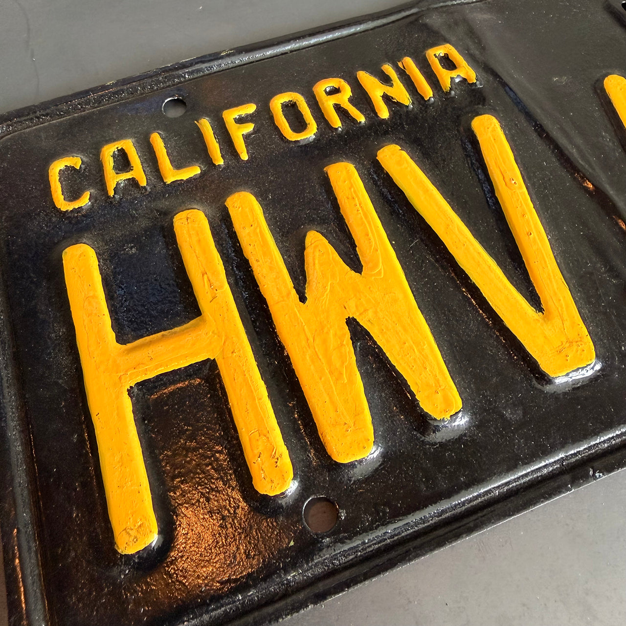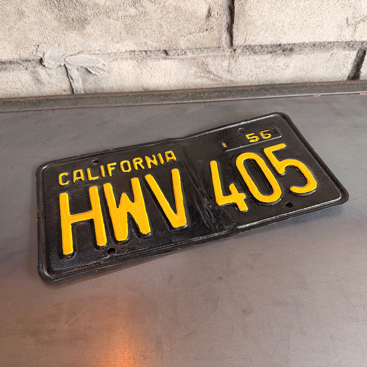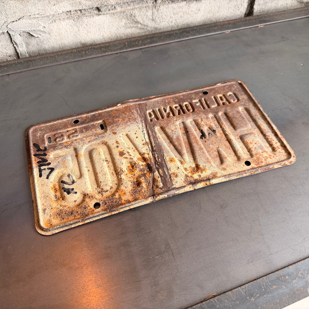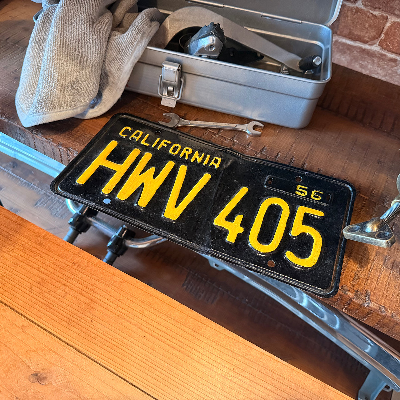 アメリカで直接仕入れた1956年製のカリフォルニア州ナンバープレート。実際に使用されていた歴史を持ち、手作業によるリペイントが独特の風合いを醸し出しています。(リペイント時期は不明)