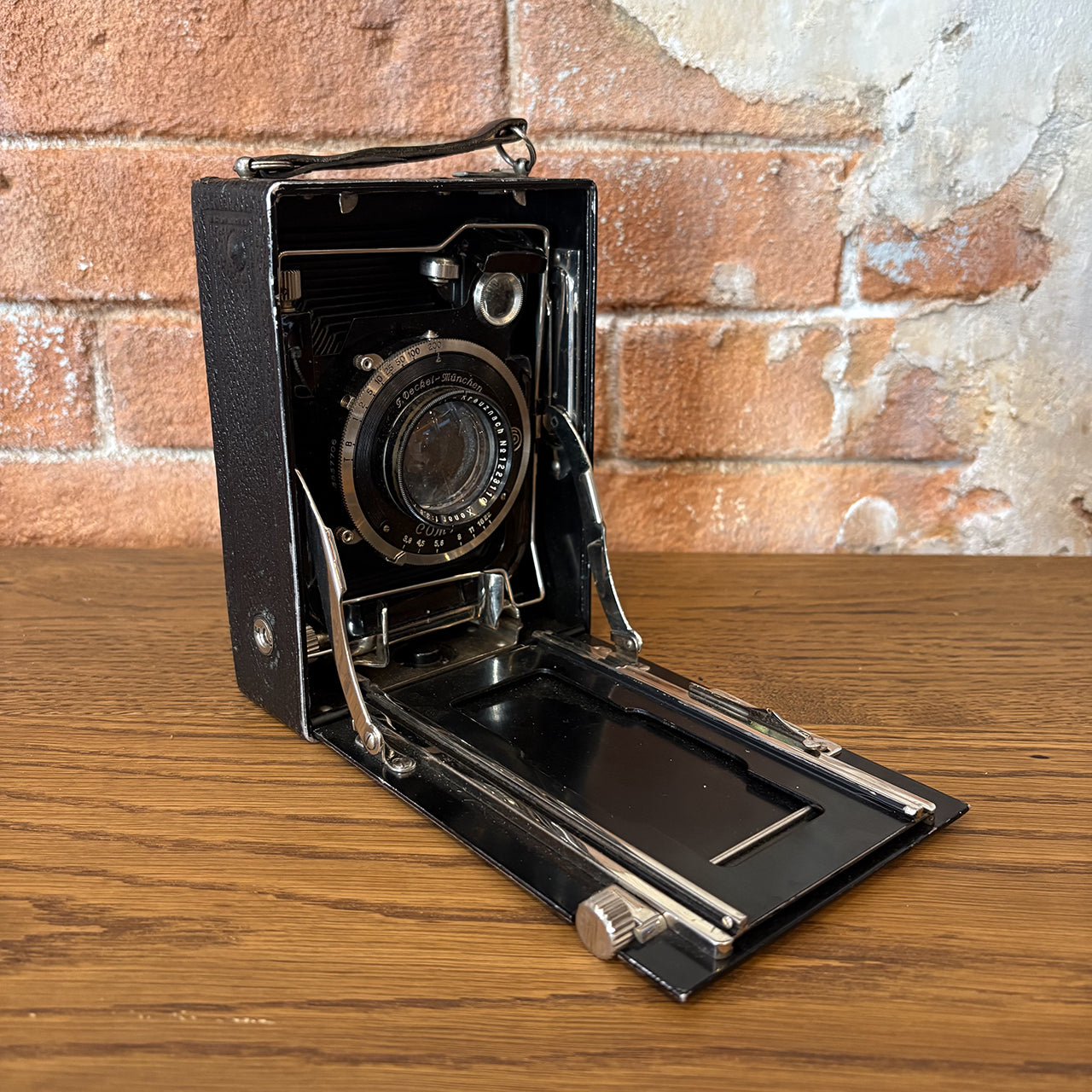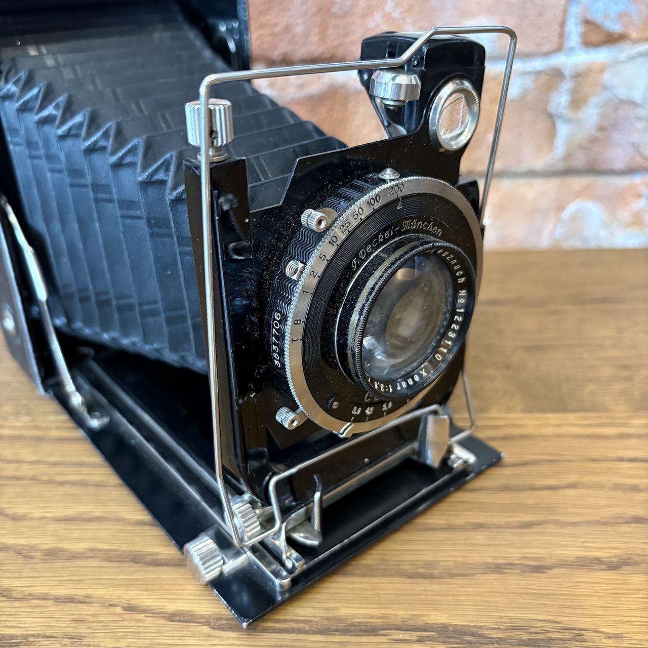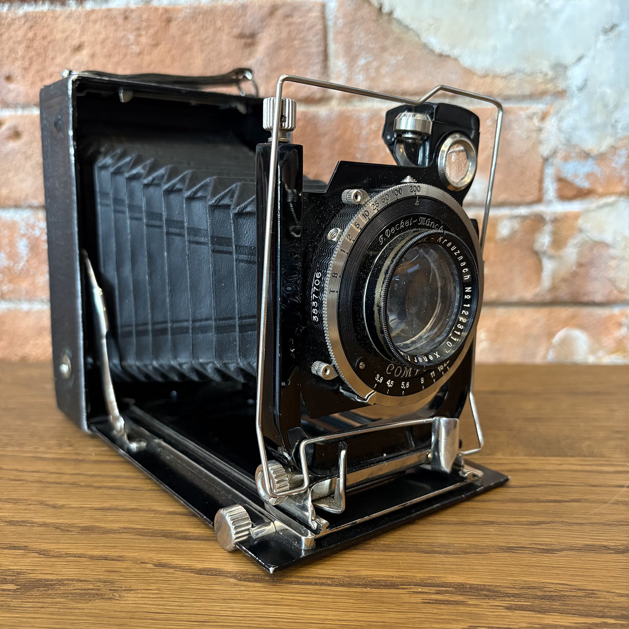 ドイツの名門メーカーF. Deckel-Münchenが手掛けたヴィンテージカメラ。アメリカで買い付けた本物のアンティークアイテムで、精密なシャッターメカニズムとクラシックなデザインが、インテリアとしても圧倒的な存在感を放ちます。