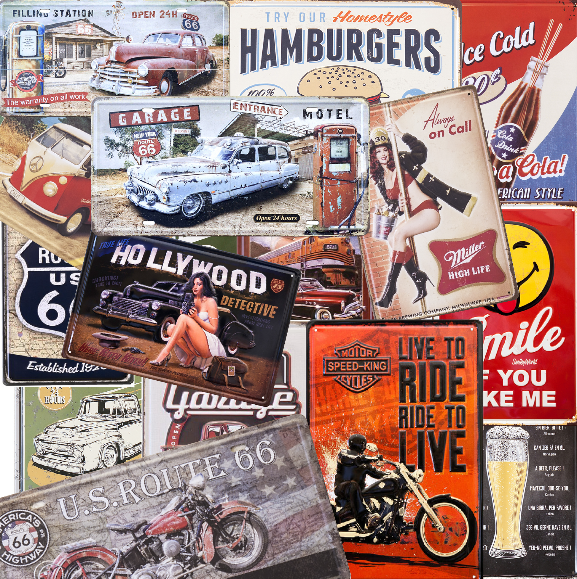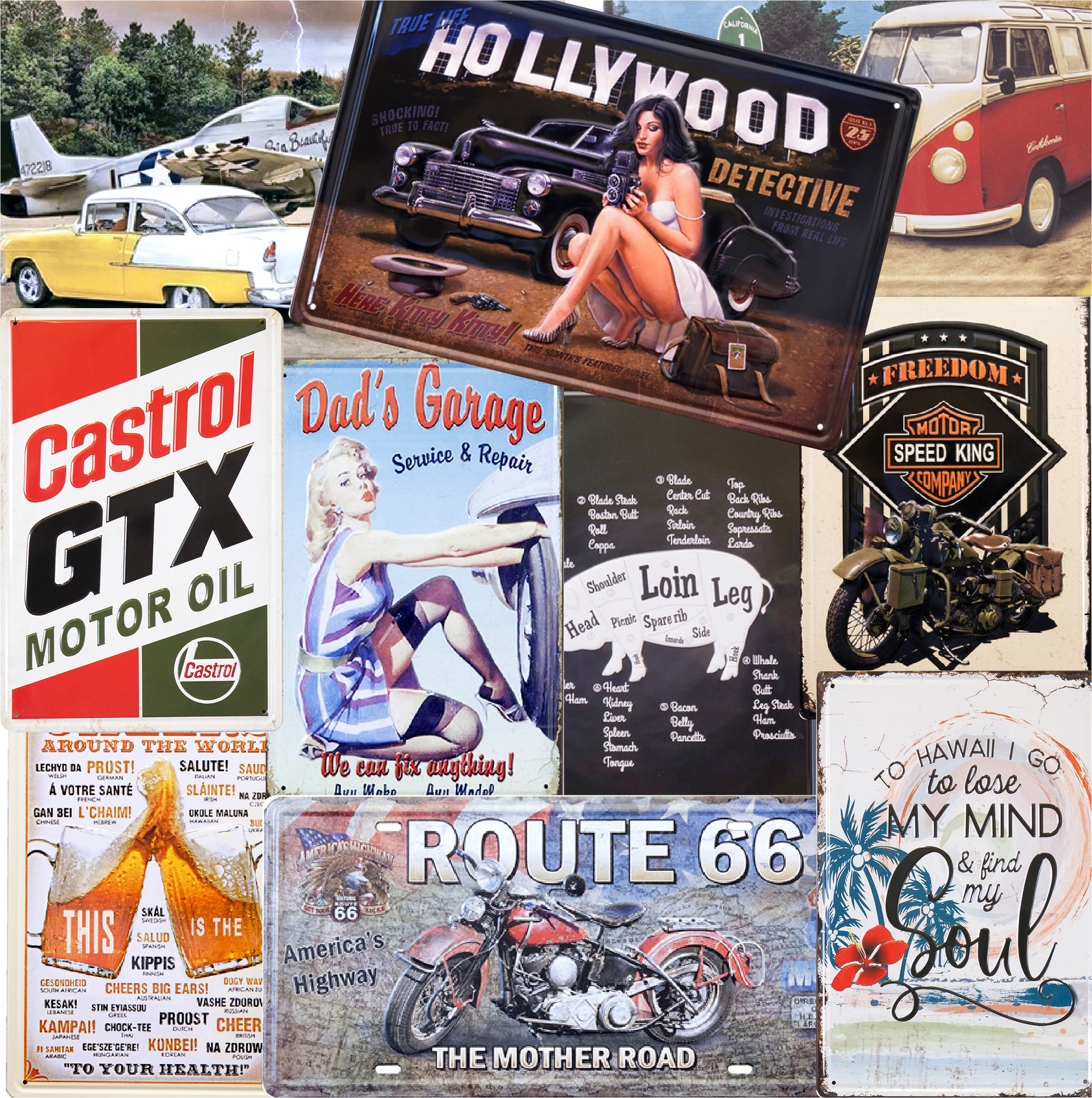アメリカンヴィンテージ風のメタルプレートは、ガレージの壁や棚に飾るだけで雰囲気が一変。サビ加工やエンボス加工が施され、リアルな質感が空間に深みを与えます。6枚セットで、レイアウトも自由自在。※玄関マットの雰囲気に合わせたものをお届けします。