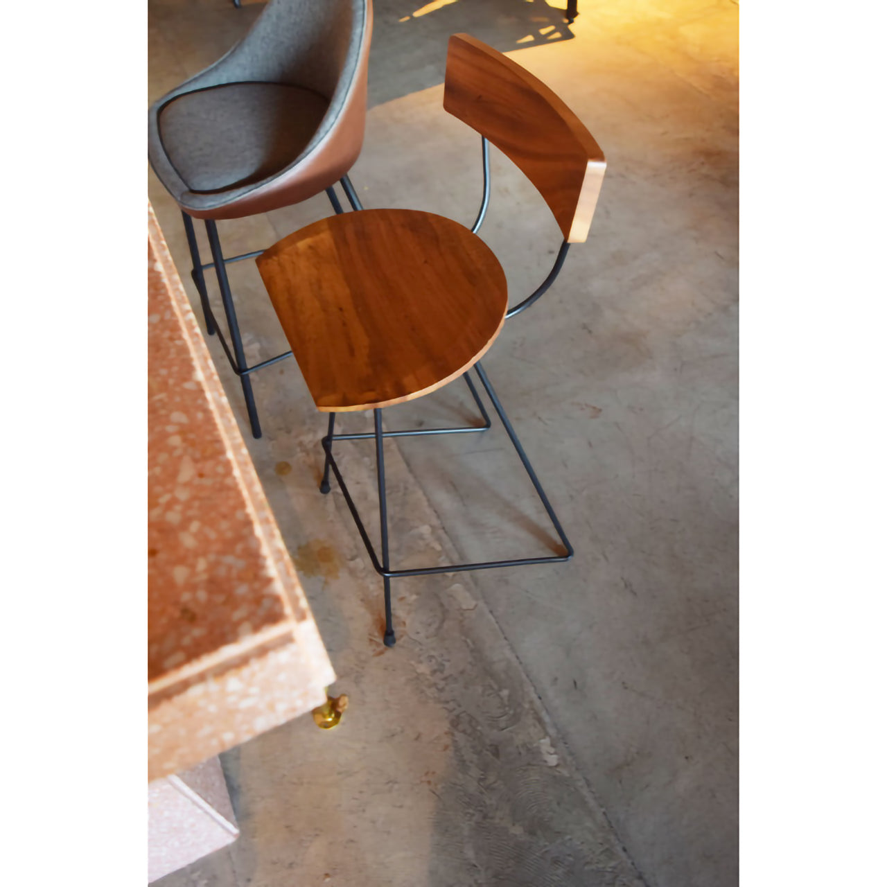 スチール脚は粉体塗装で仕上げられ、錆びにくく長持ち。