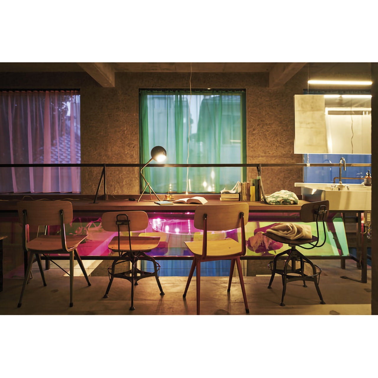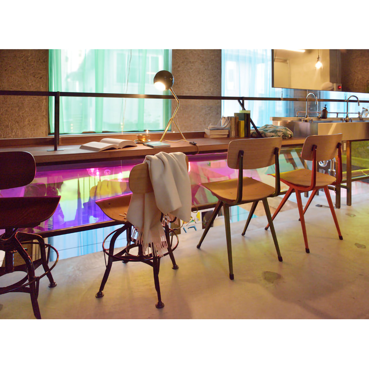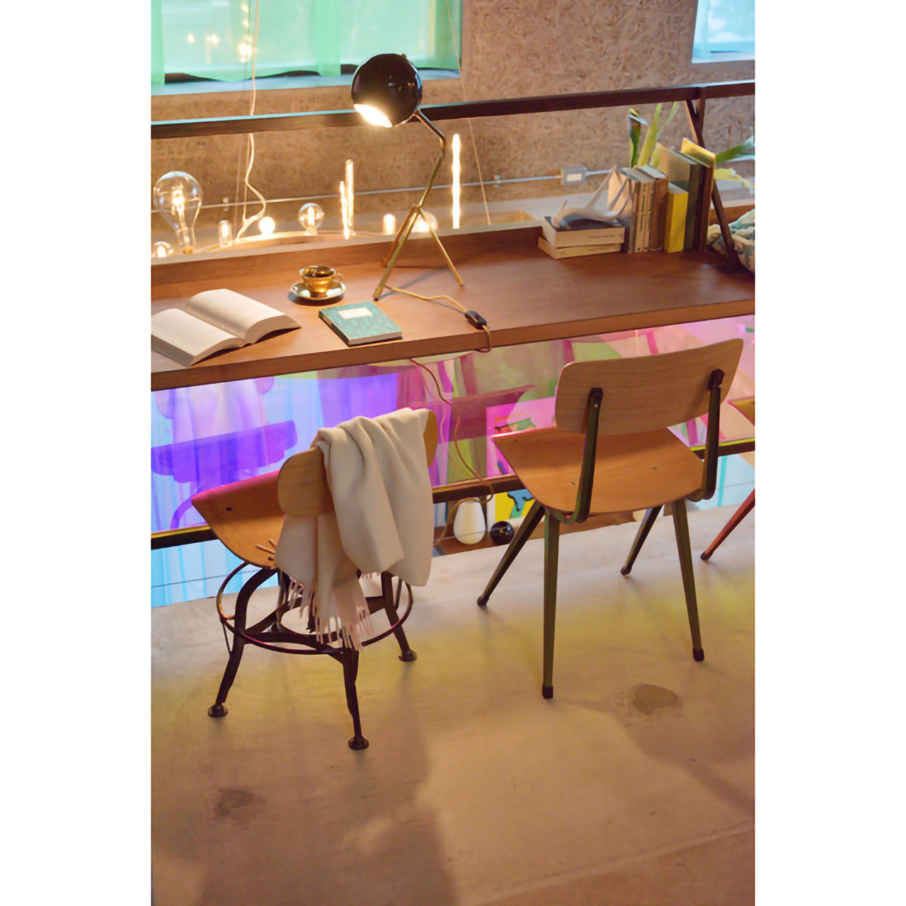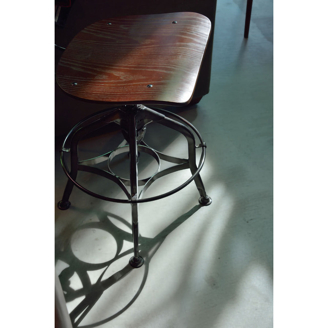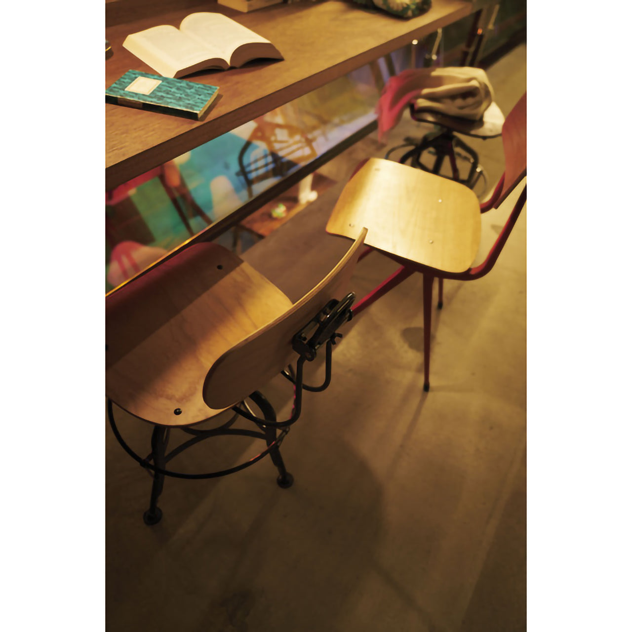 座面下のレバーで高さ調整、背もたれ裏のネジで10段階の調整が可能。脚先は可動式で床にしっかりフィットし、ガタつきも防止。積層合板(アッシュ材)の美しい木目とラッカー塗装が、ヴィンテージ感をしっかり演出します。