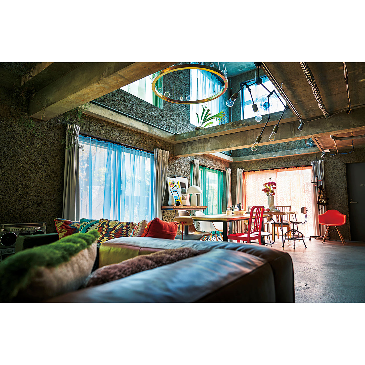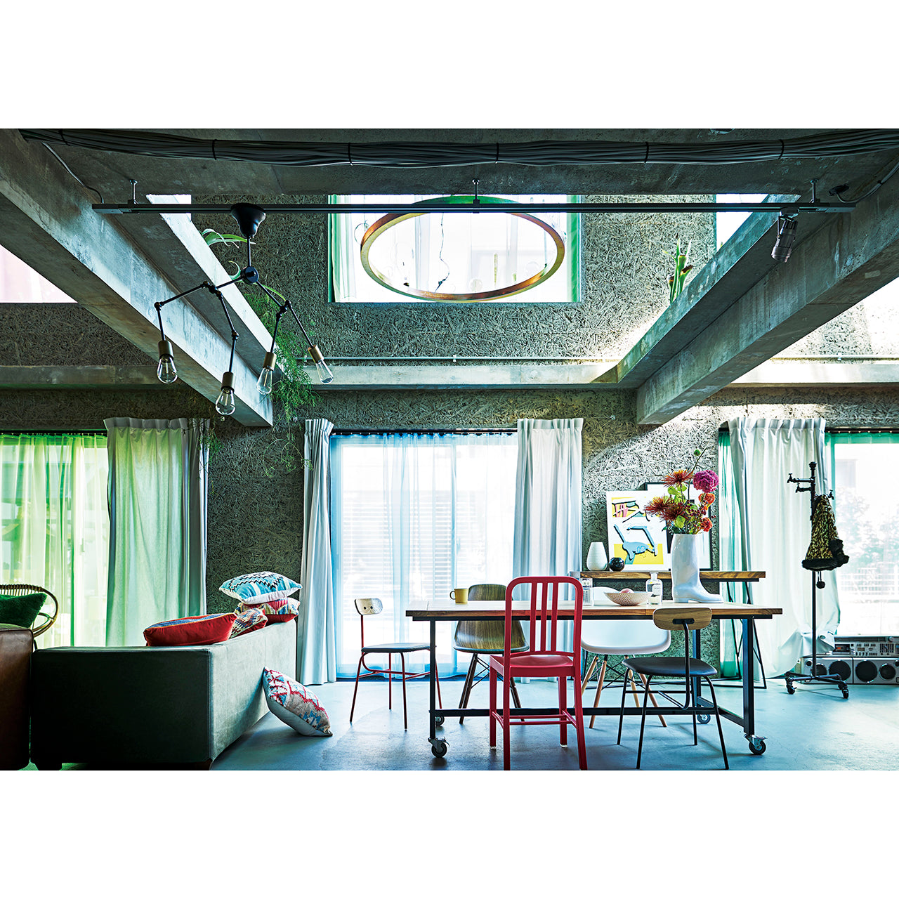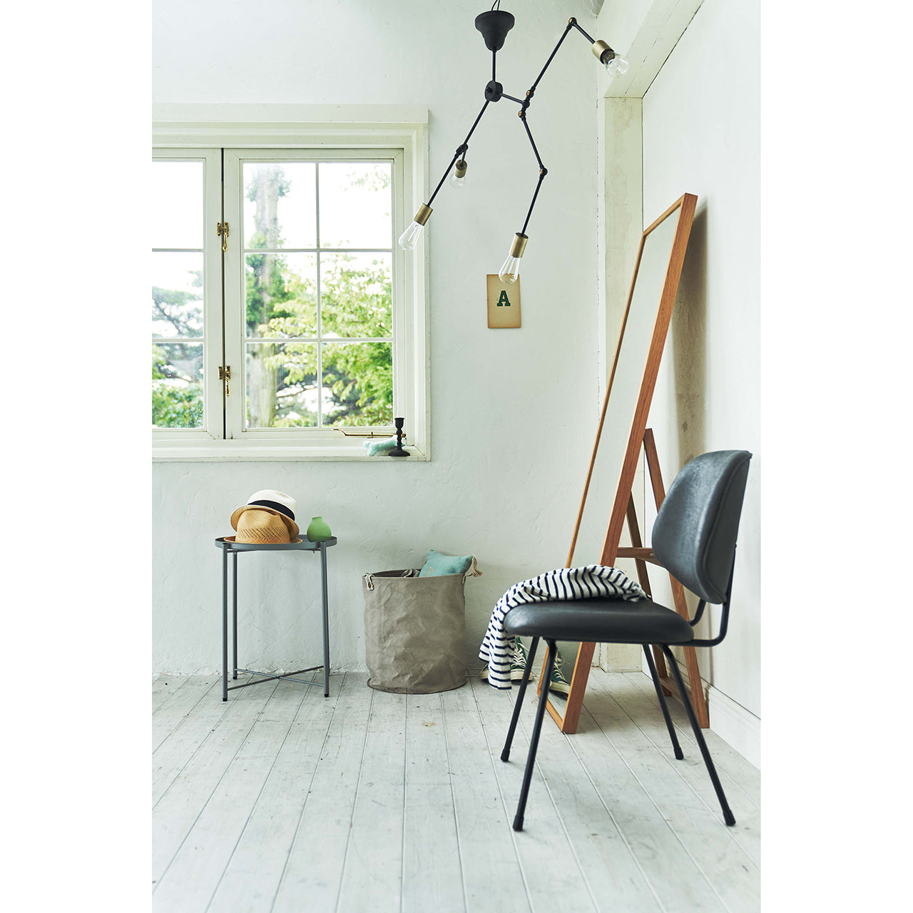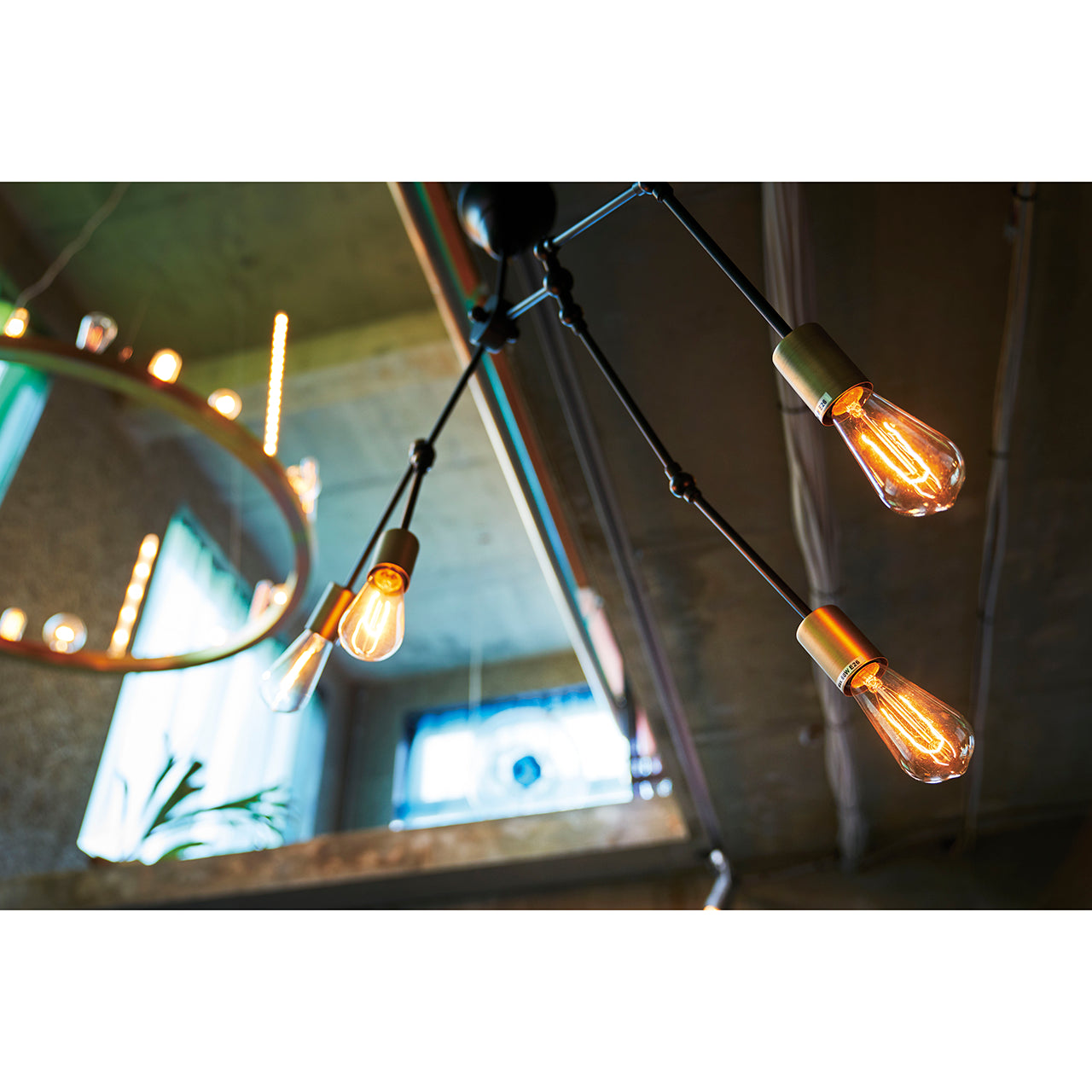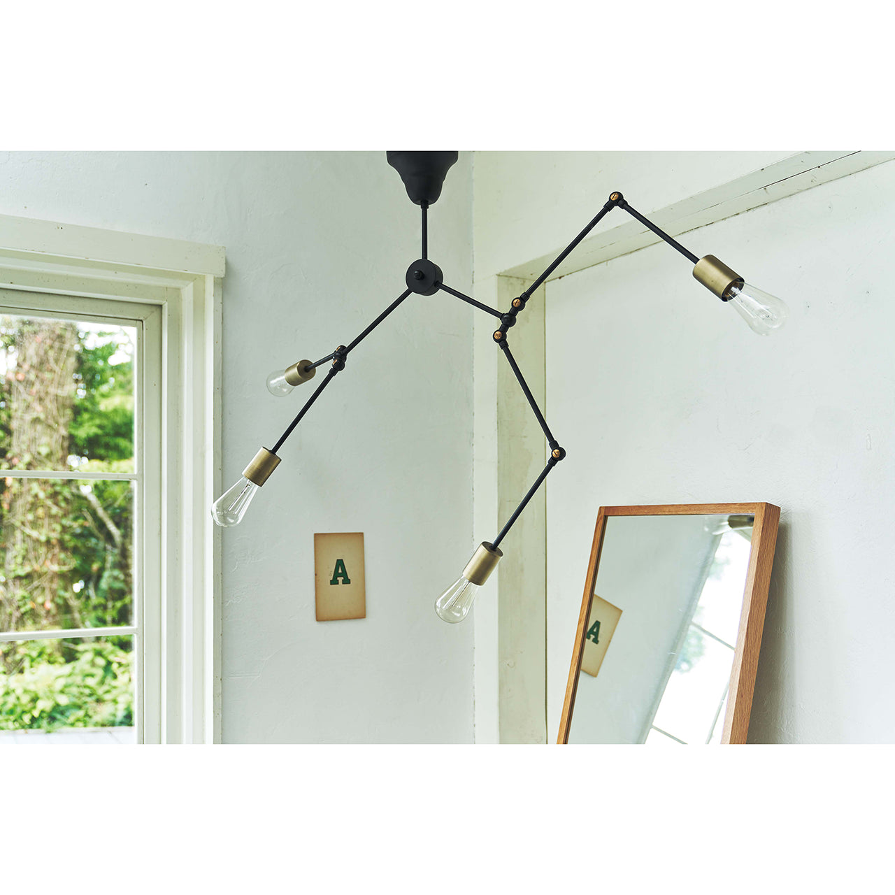 それぞれのアームは角度調整が可能で、光の向きを自在にコントロールできるため、実用性とデザイン性を兼ね備えたアイテムです。特徴的なシェード形状とカラーのコントラストが空間にアクセントを加え、ブルックリン・北欧・ヴィンテージなどのインテリアに自然に馴染みます。