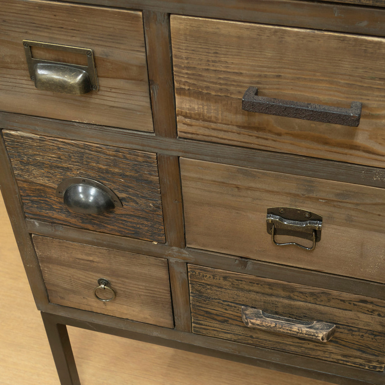 素材    本体:モミ古材/引出:モミ・パイン・エルム古材/脚部:スチール(黒皮風塗装)