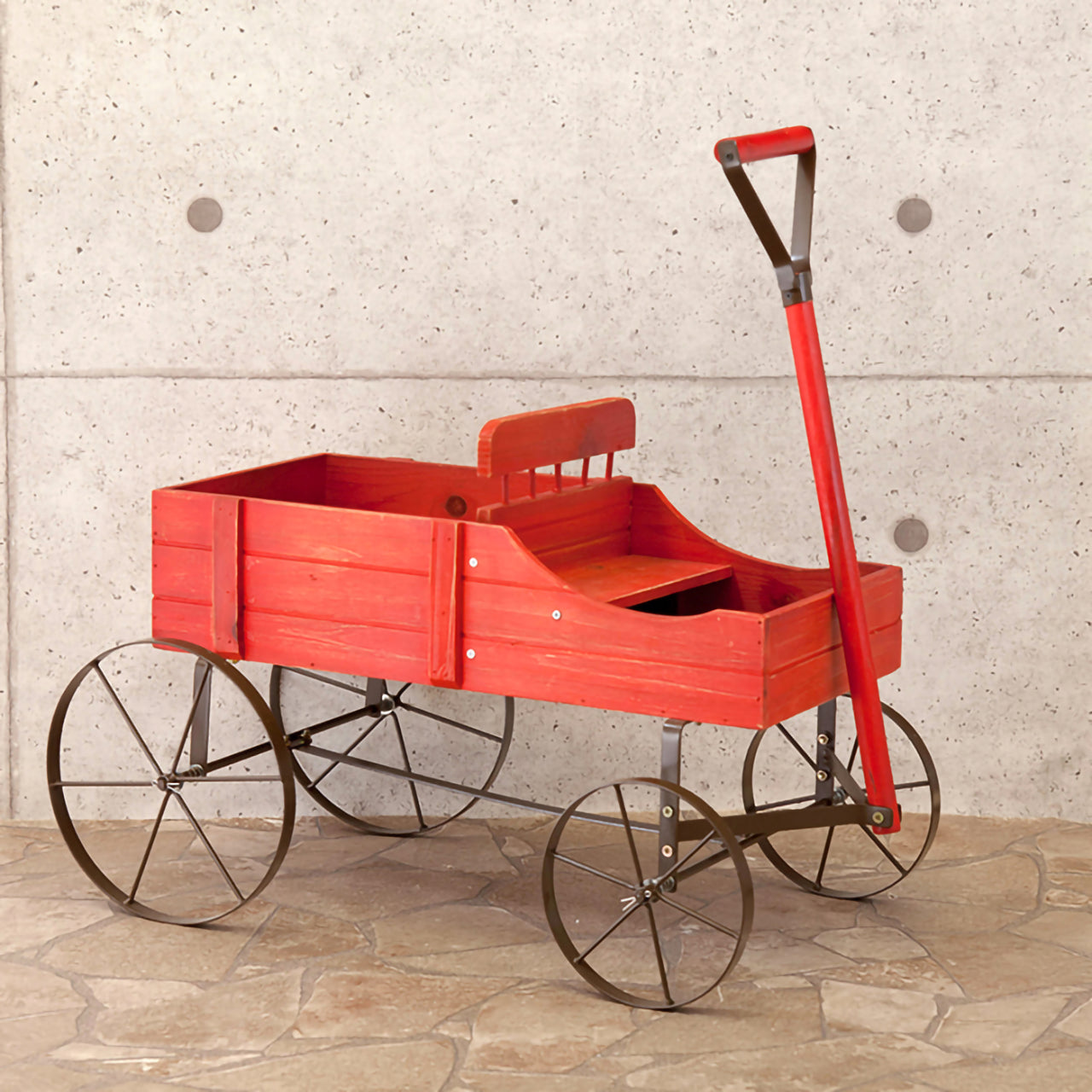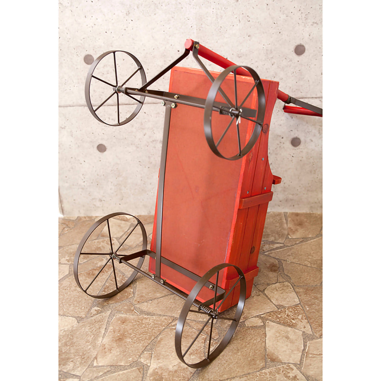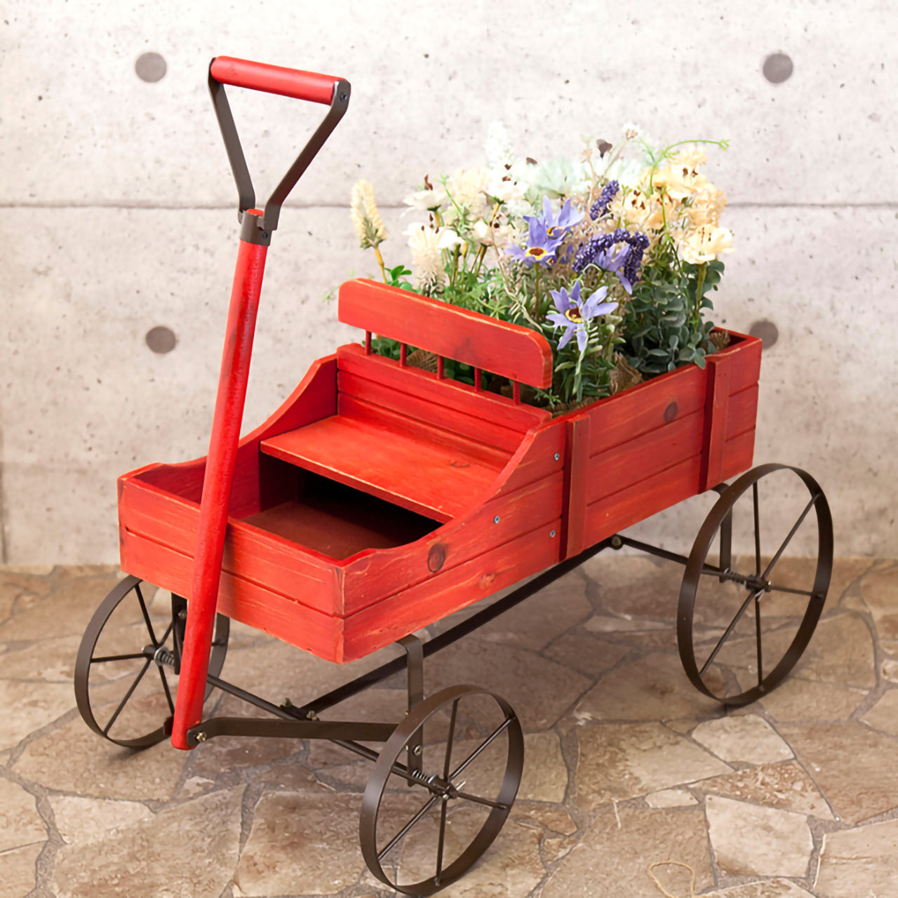お庭や玄関先に置くだけで、植物のある暮らしがぐっとおしゃれに。赤い車輪がアクセントになり、グリーンとの相性も抜群です。