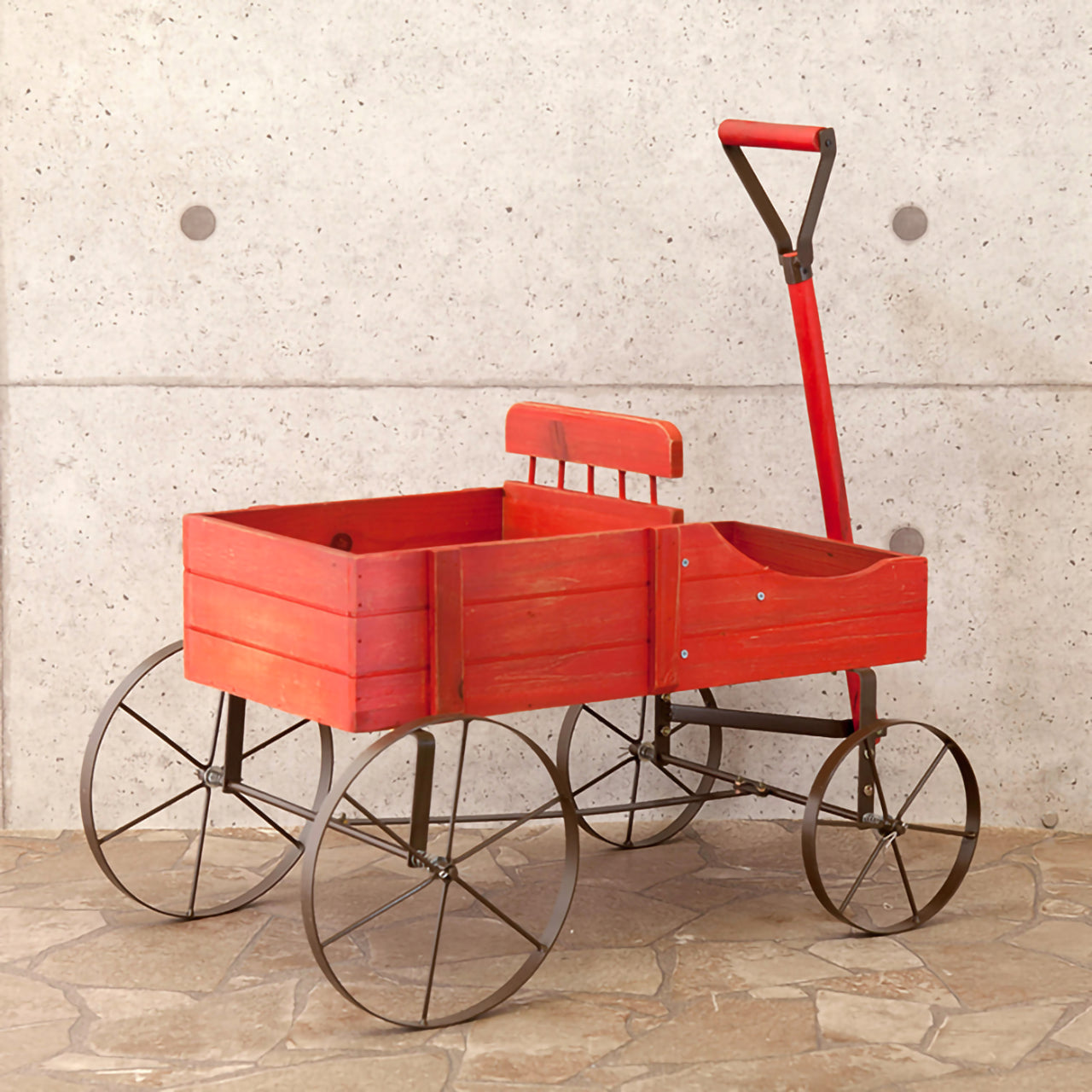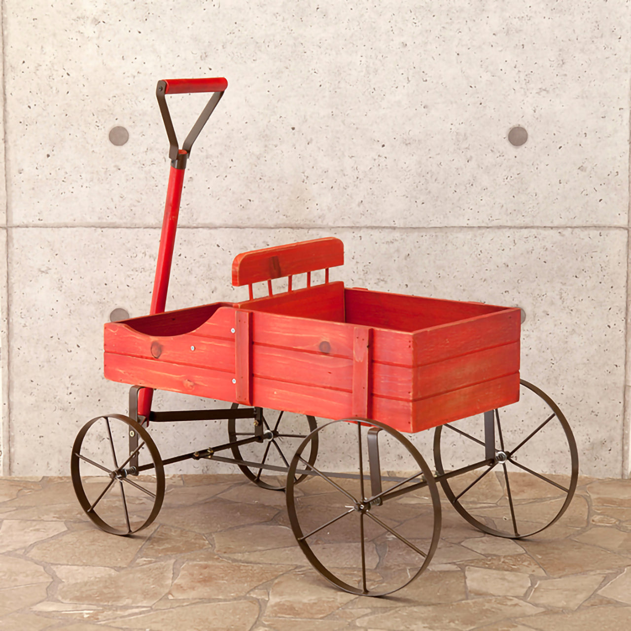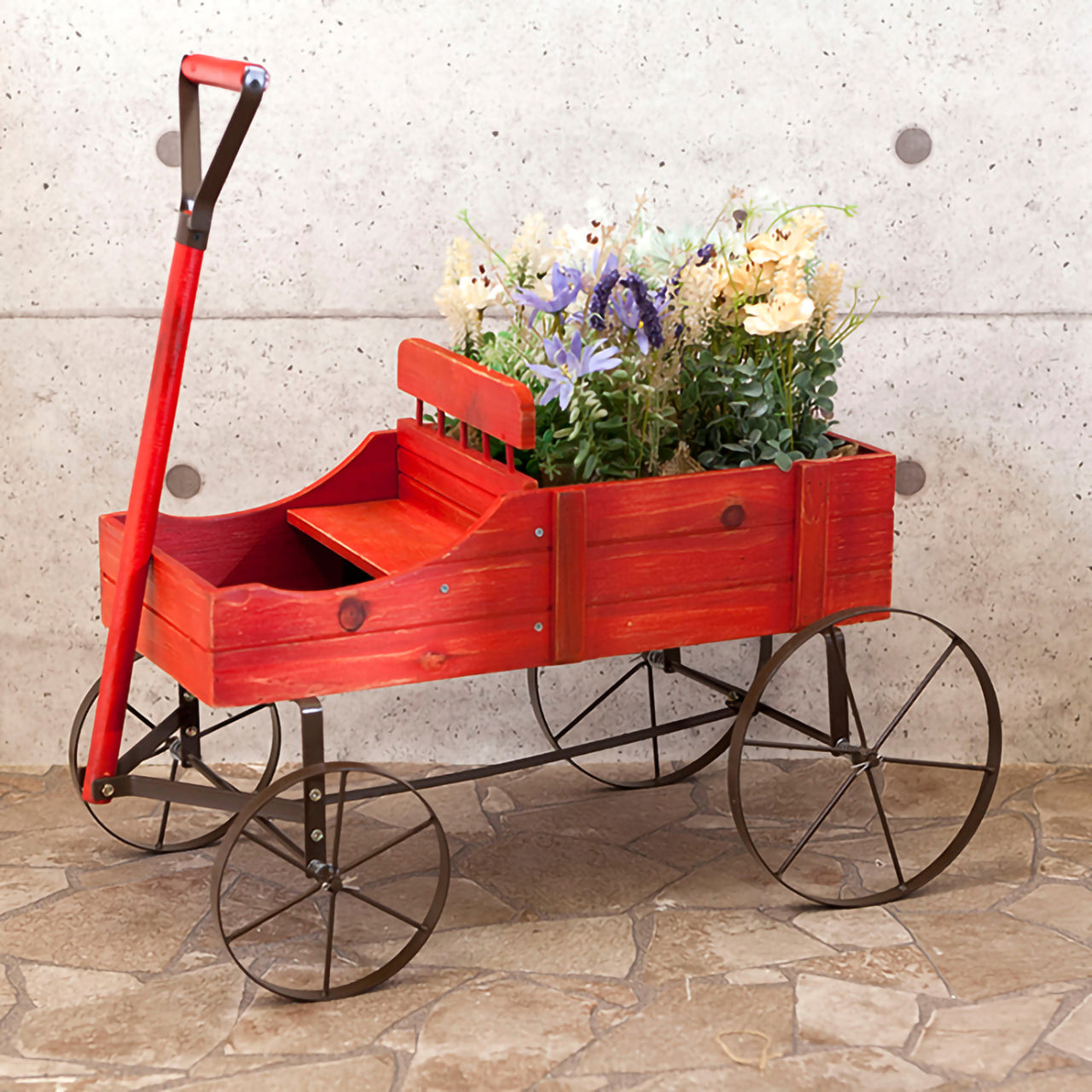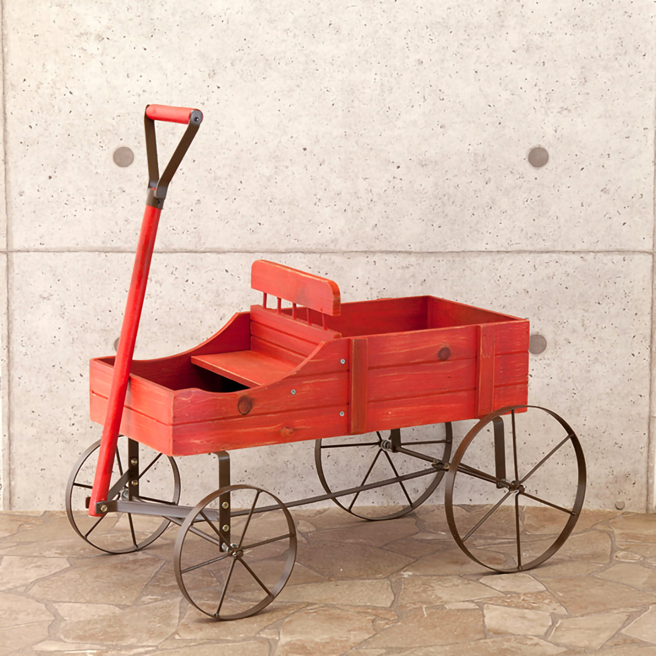 お庭や玄関先に置くだけで、植物のある暮らしがぐっとおしゃれに。赤い車輪がアクセントになり、グリーンとの相性も抜群です。