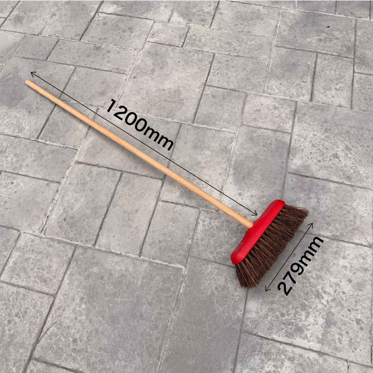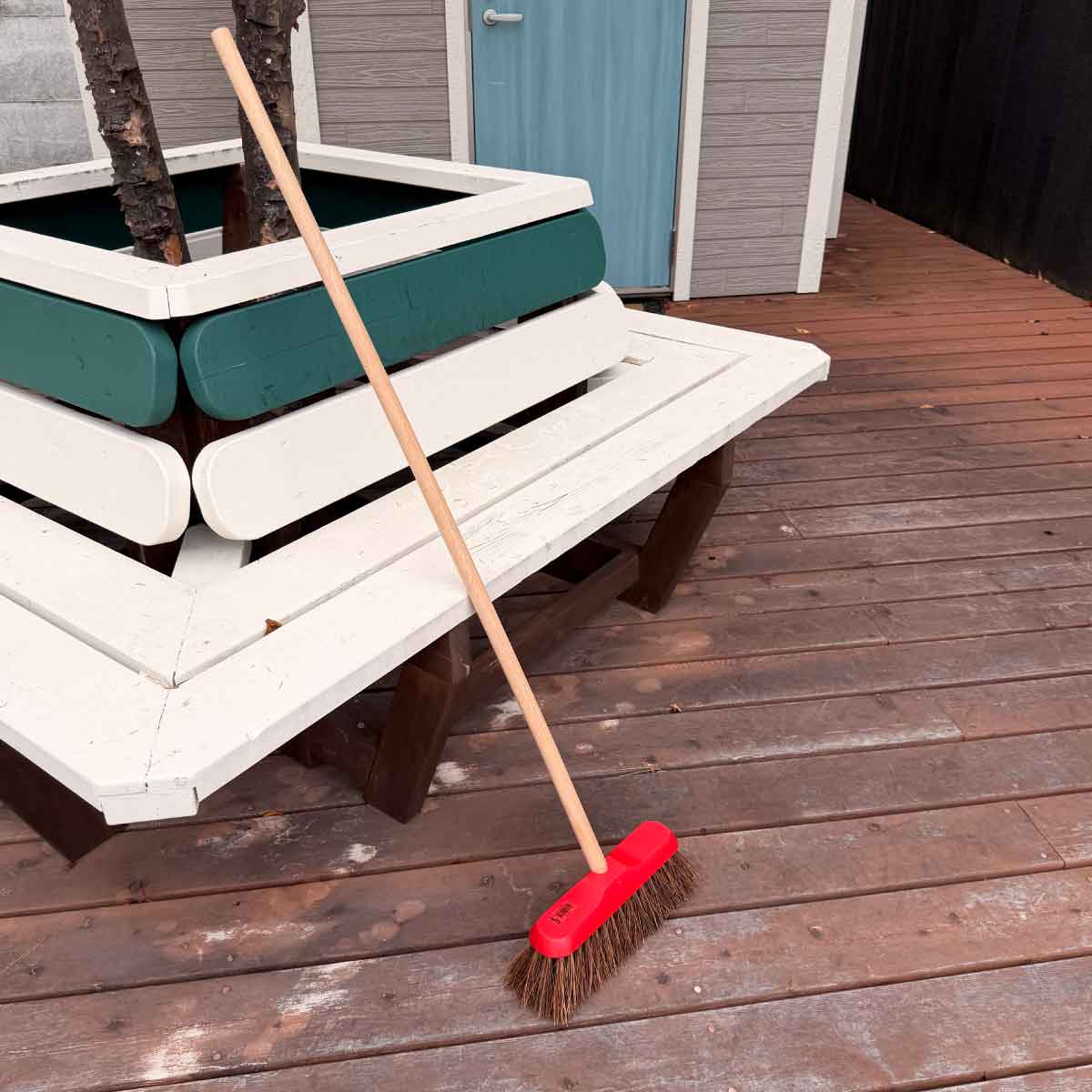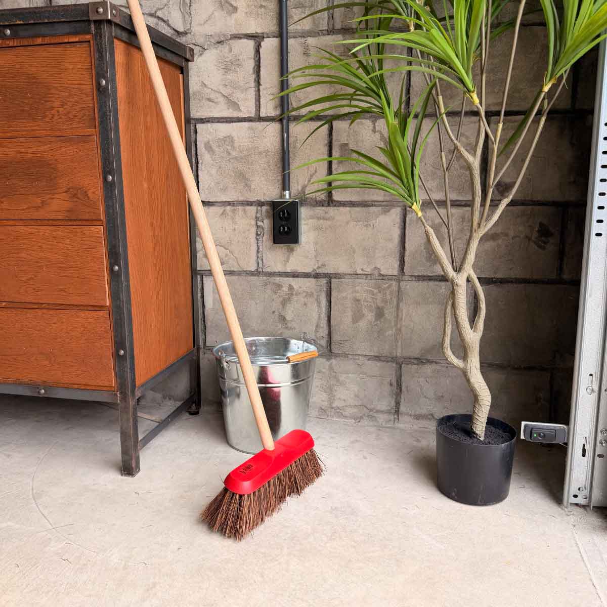 ブラシ部分には硬めのパルミラヤシ繊維を使用し、玄関・ベランダ・ガレージなどの乾いた場所の掃き掃除に最適。