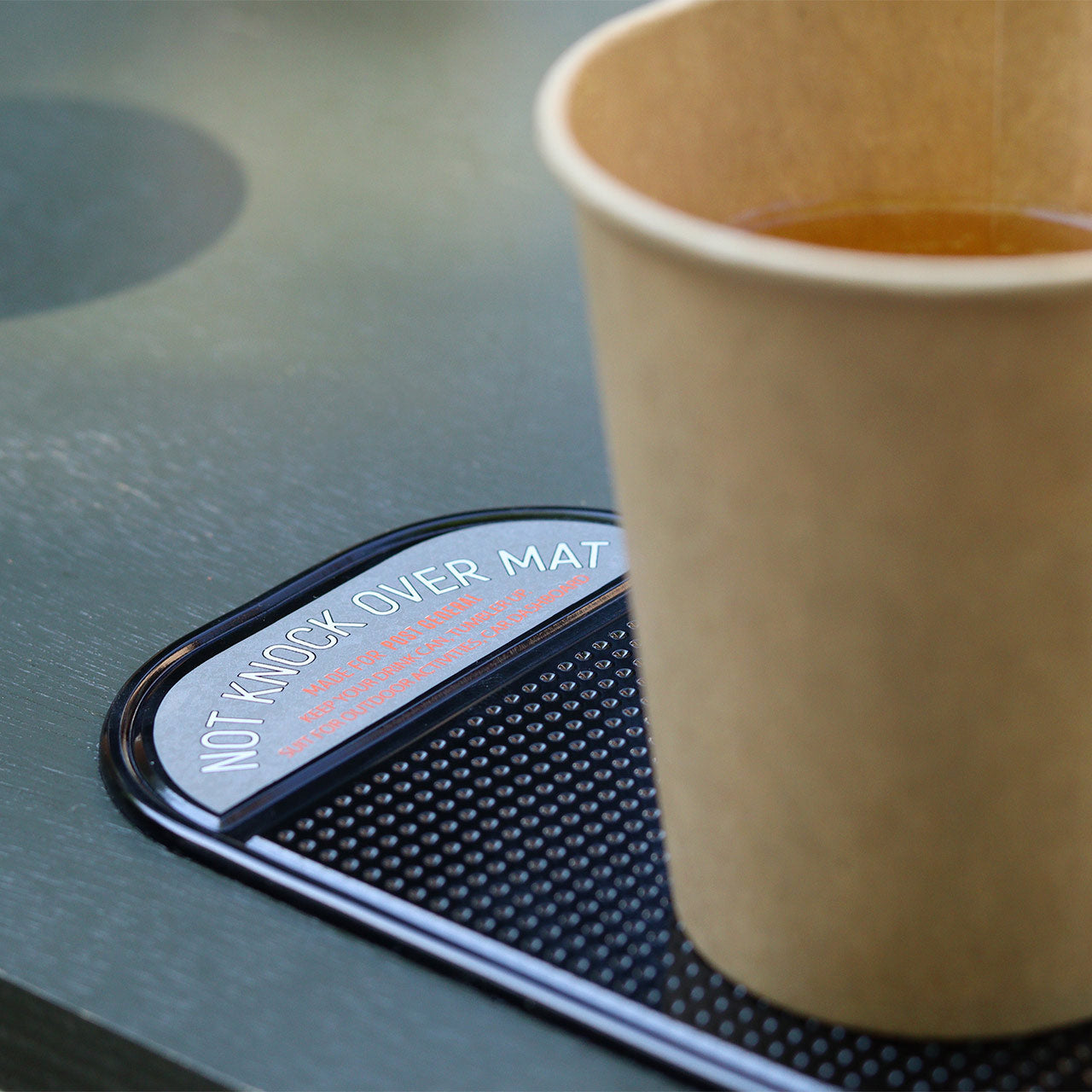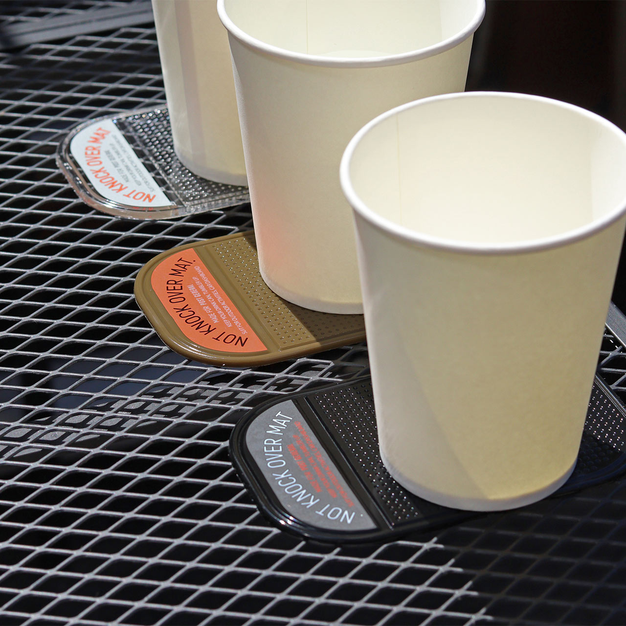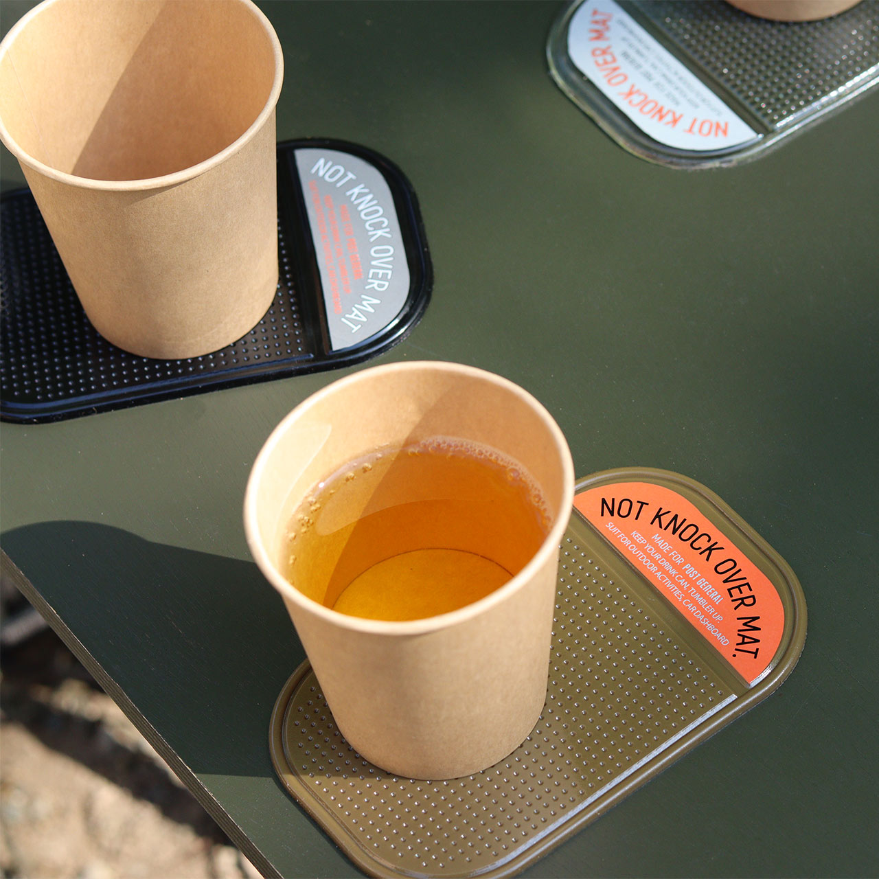 そんなあるあるシーンにお勧めの「NOT KNOCK OVER MAT=倒れないマット」粘着性のあるPUゲル素材は、鉄や樹脂、ガラスなど様々な素材に粘着し、紙コップやビール缶、スマートフォンやサングラスなどを簡単に付けたり外したりすることが可能です。