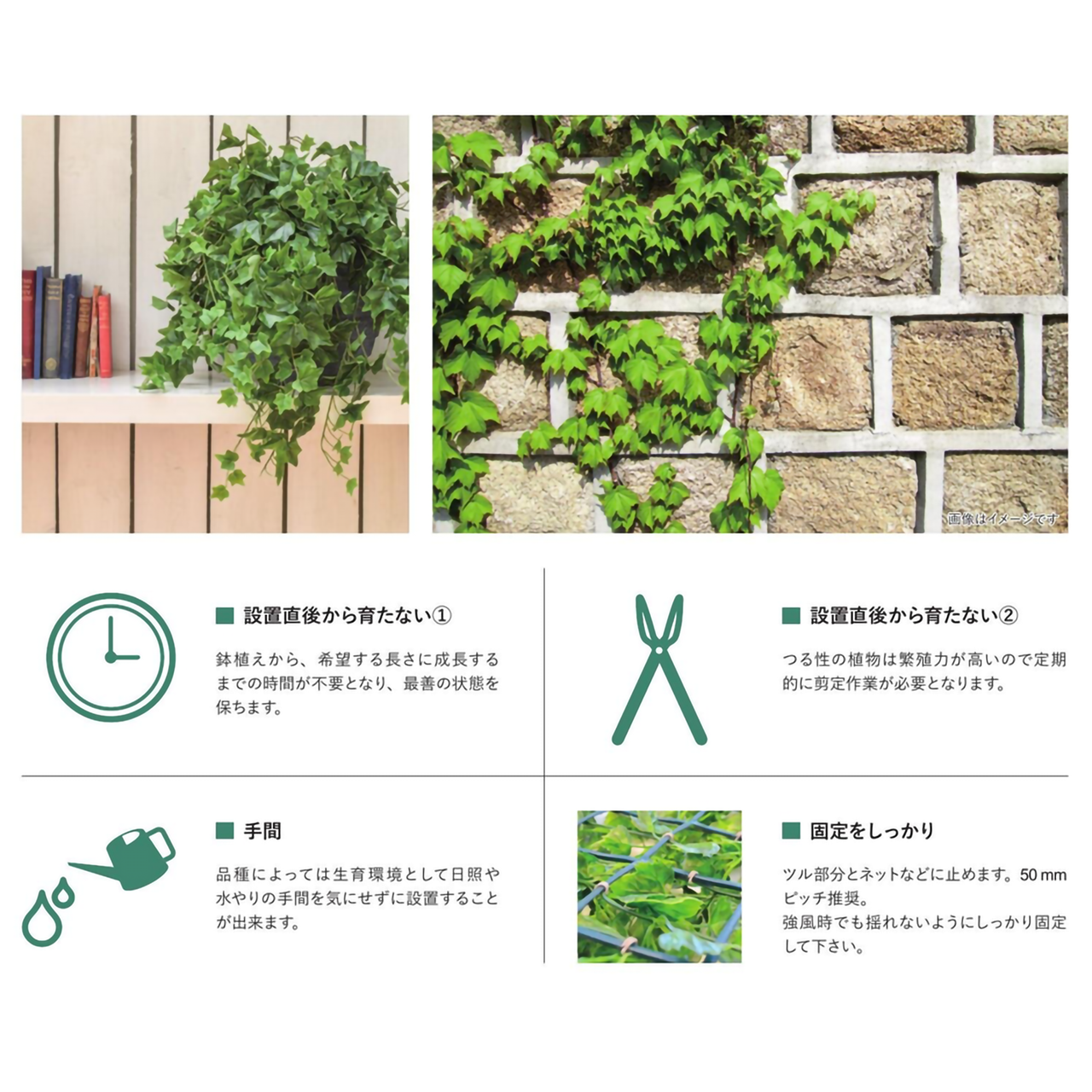 この商品は、グローベン社が開発した耐候性ポリエステル素材を使用しており、紫外線や湿気にも強く、長期間にわたって美しい状態を保ちます。天然植物のように剪定や水やりの手間がなく、設置後はほとんどメンテナンス不要です。