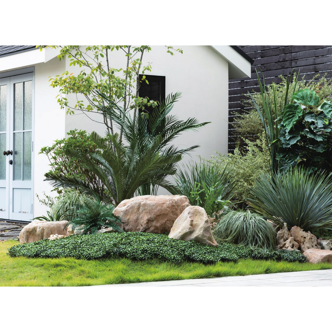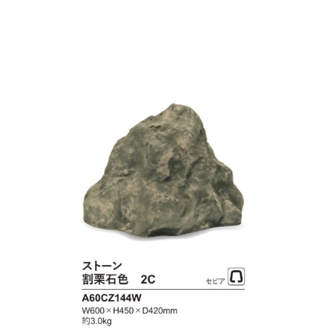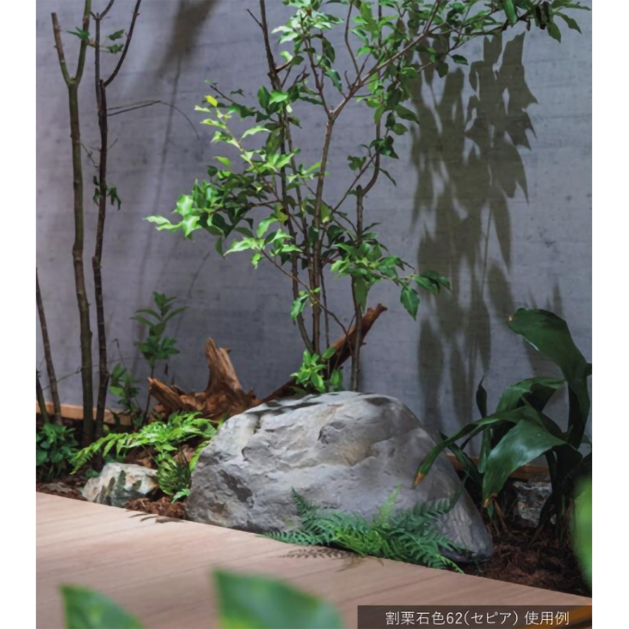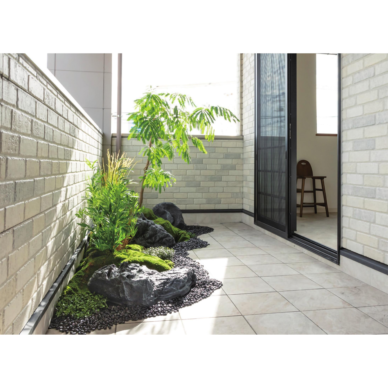 グローベン社の「リフェイクストーン 割栗石色」は、天然の割栗石の質感を忠実に再現した人工庭石です。見た目はまるで本物の石のようですが、素材にはFRP(グラスファイバー混合ポリエステル樹脂)を使用しており、約0.6kg~約5.5kgと非常に軽量。そのため、重機を使わずに女性でも簡単に持ち運び・設置が可能です。