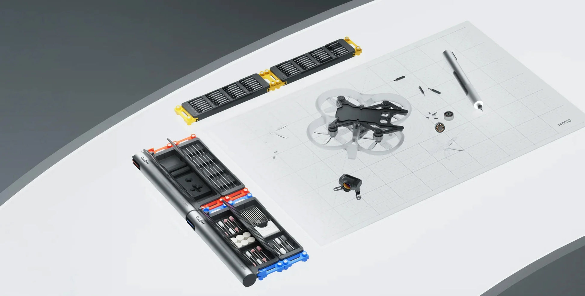 HOTOの「SNAPBLOQ 電動精密ドライバー マスターセット」は、時計・カメラ・PC・スマホ・ドローンなどの精密機器に対応した、高性能なペン型電動ドライバー。