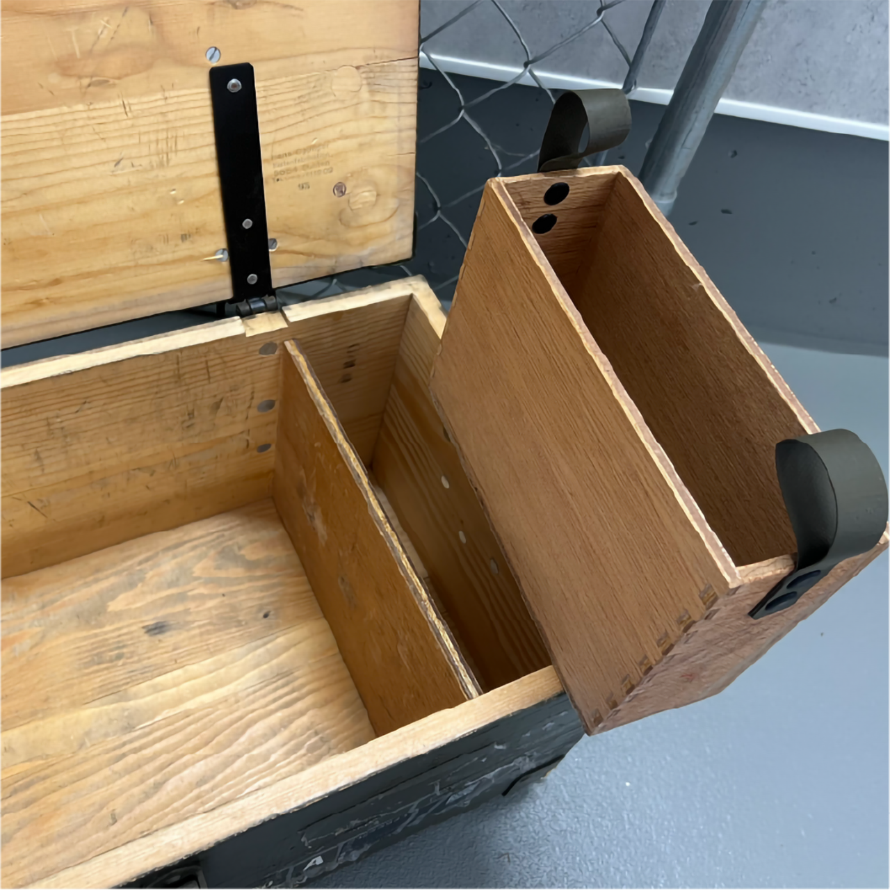 本物のスイス軍が使用していた野戦電話収納用ウッドボックス。無骨で重厚な雰囲気が、ガレージやショップ空間にリアルなミリタリーテイストを加えます。
