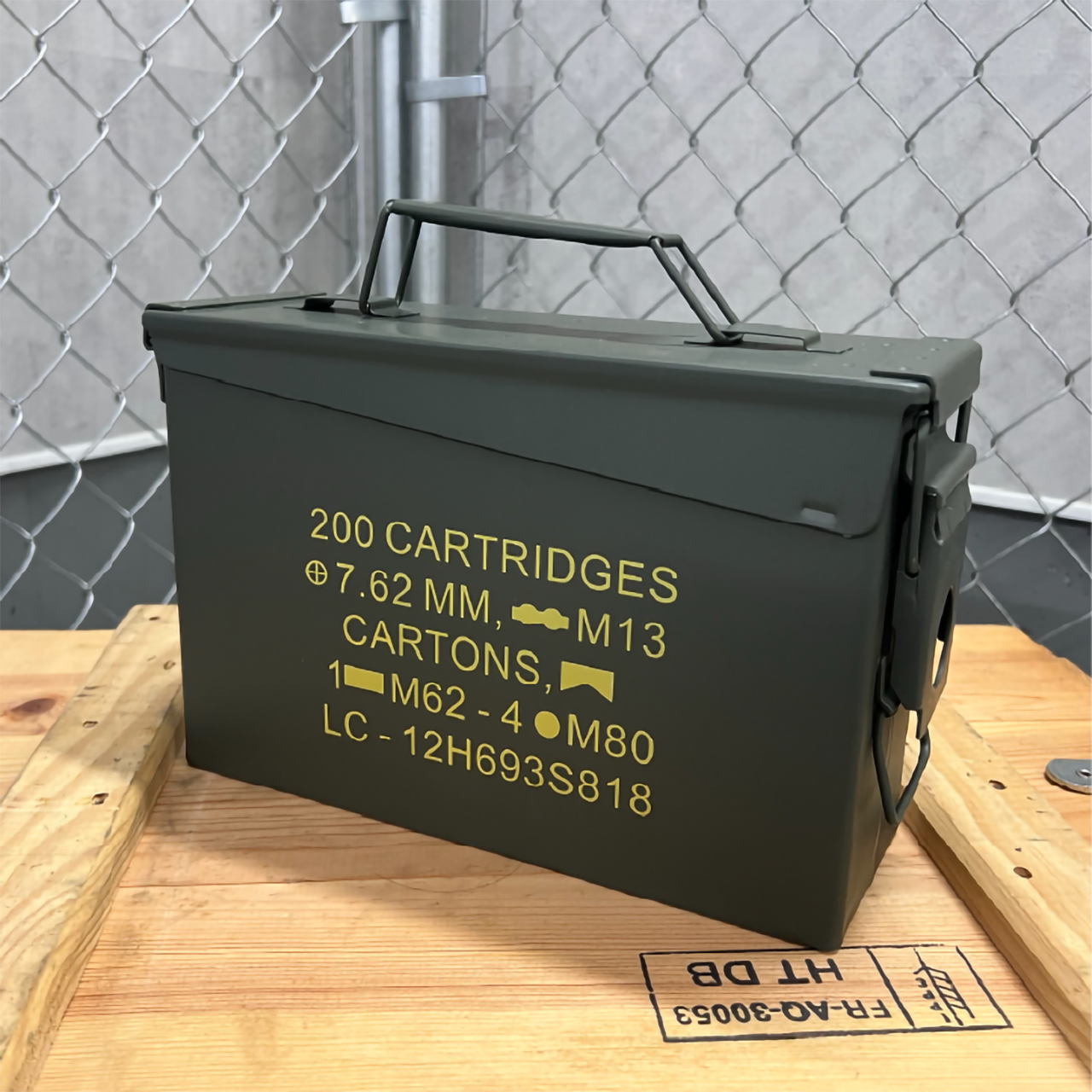 アメリカ軍の50CAL弾薬箱をモチーフにしたレプリカモデル。スチール製のしっかりとした造りで、リアルな雰囲気を再現しています。