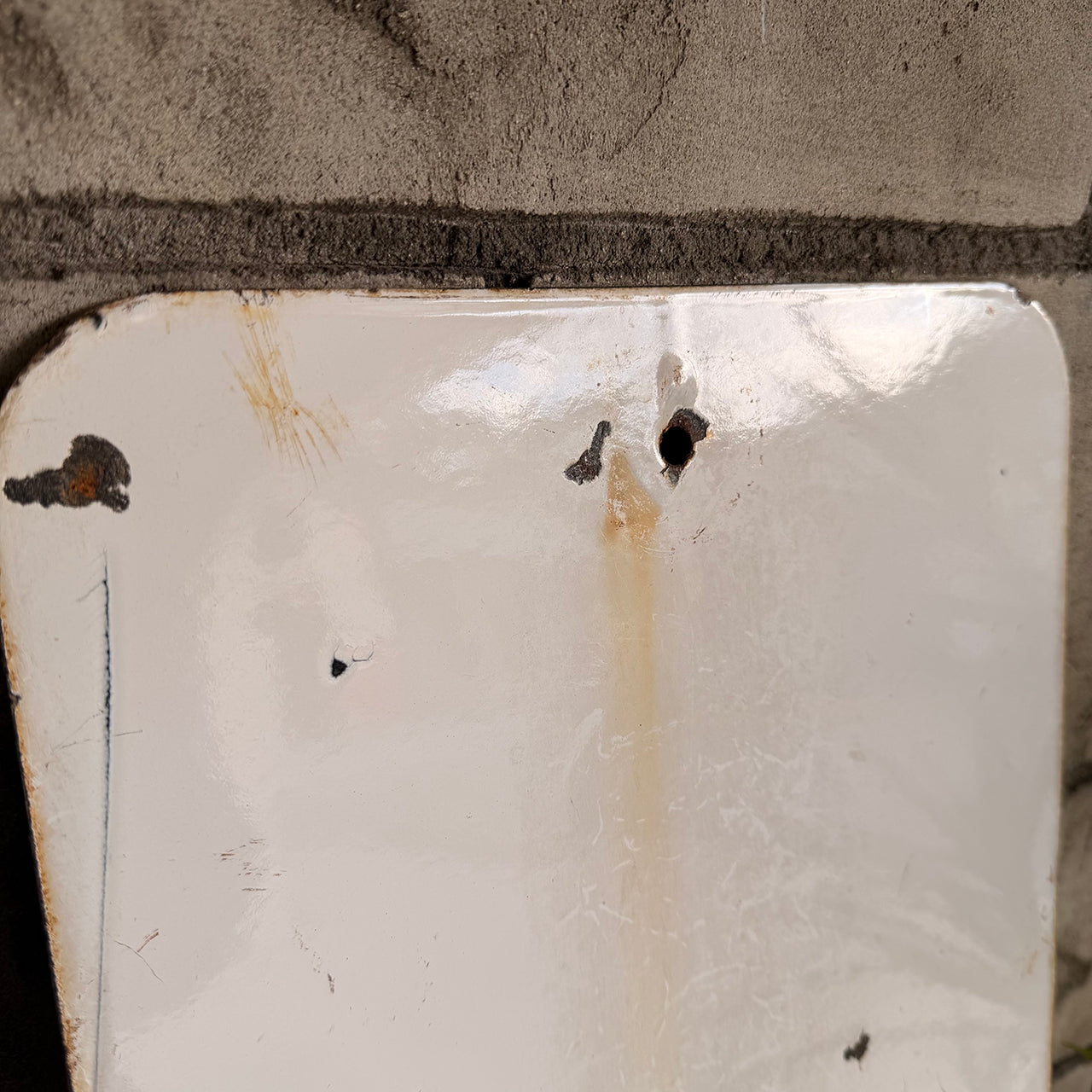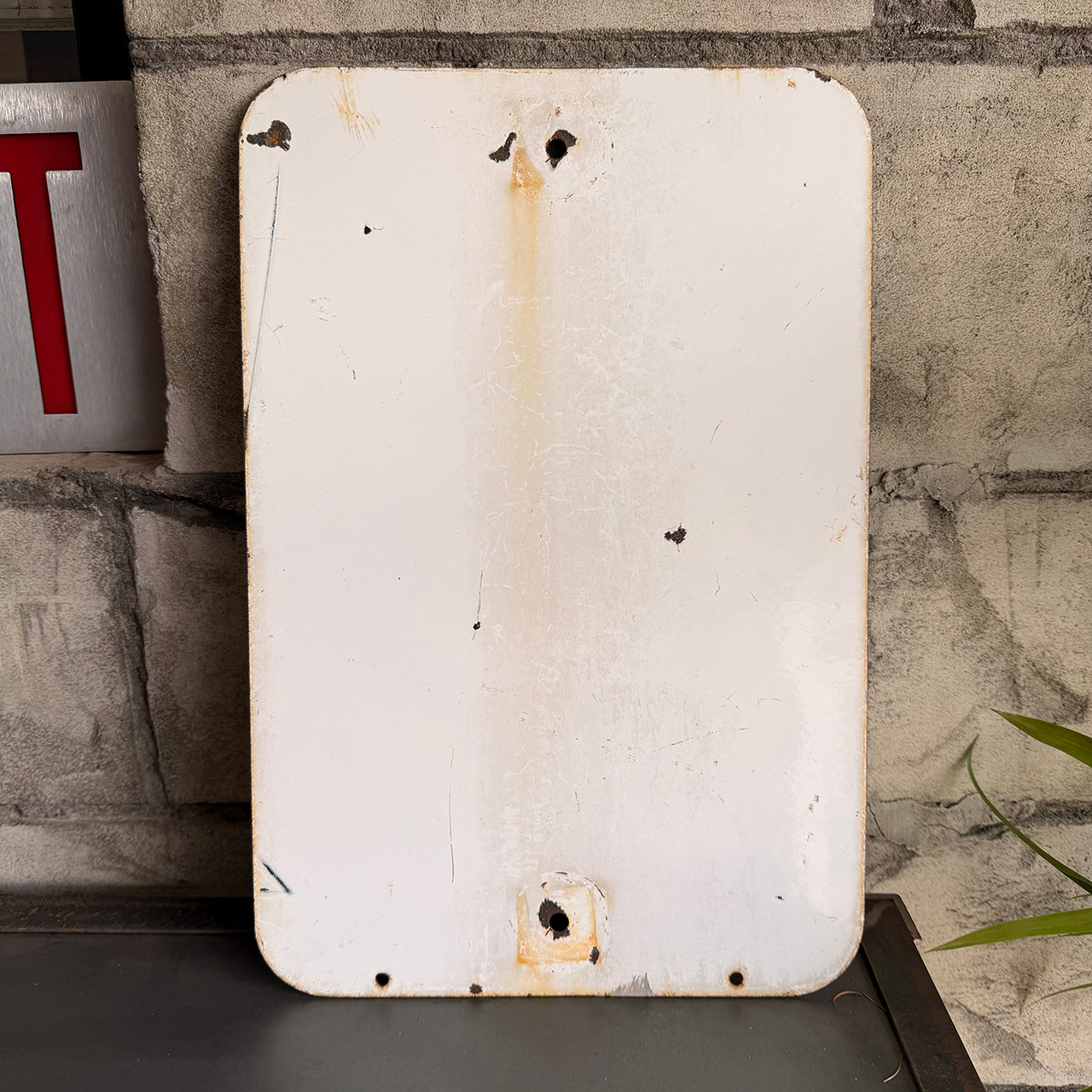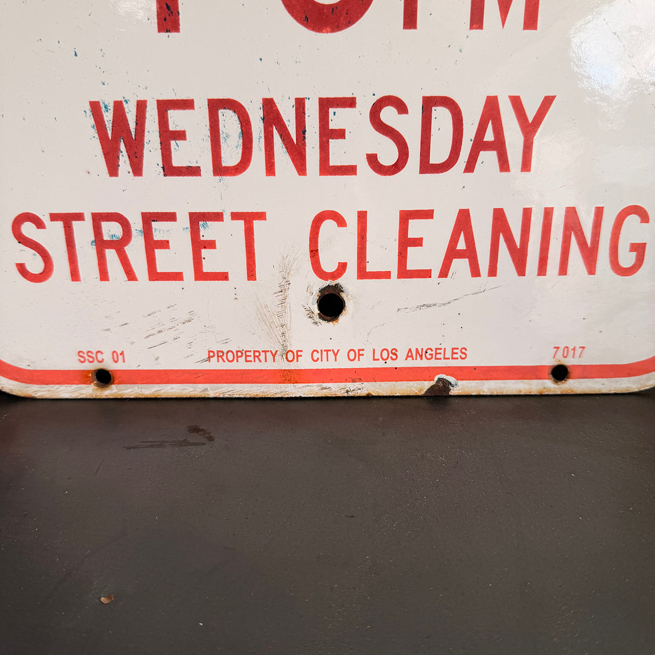 現地で直接買い付けた一点物で、使用感や小傷が歴史を物語る証拠となり、レプリカでは味わえない本物の質感と存在感を楽しめます。裏面には設置時の支柱跡が残り、さらに表面下部には「PROPERTY OF LOS ANGELES」の文字が刻まれており、実際にロサンゼルス市で使用されていた証を物語ります。