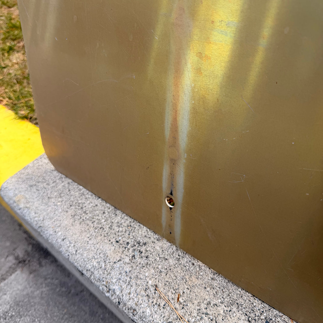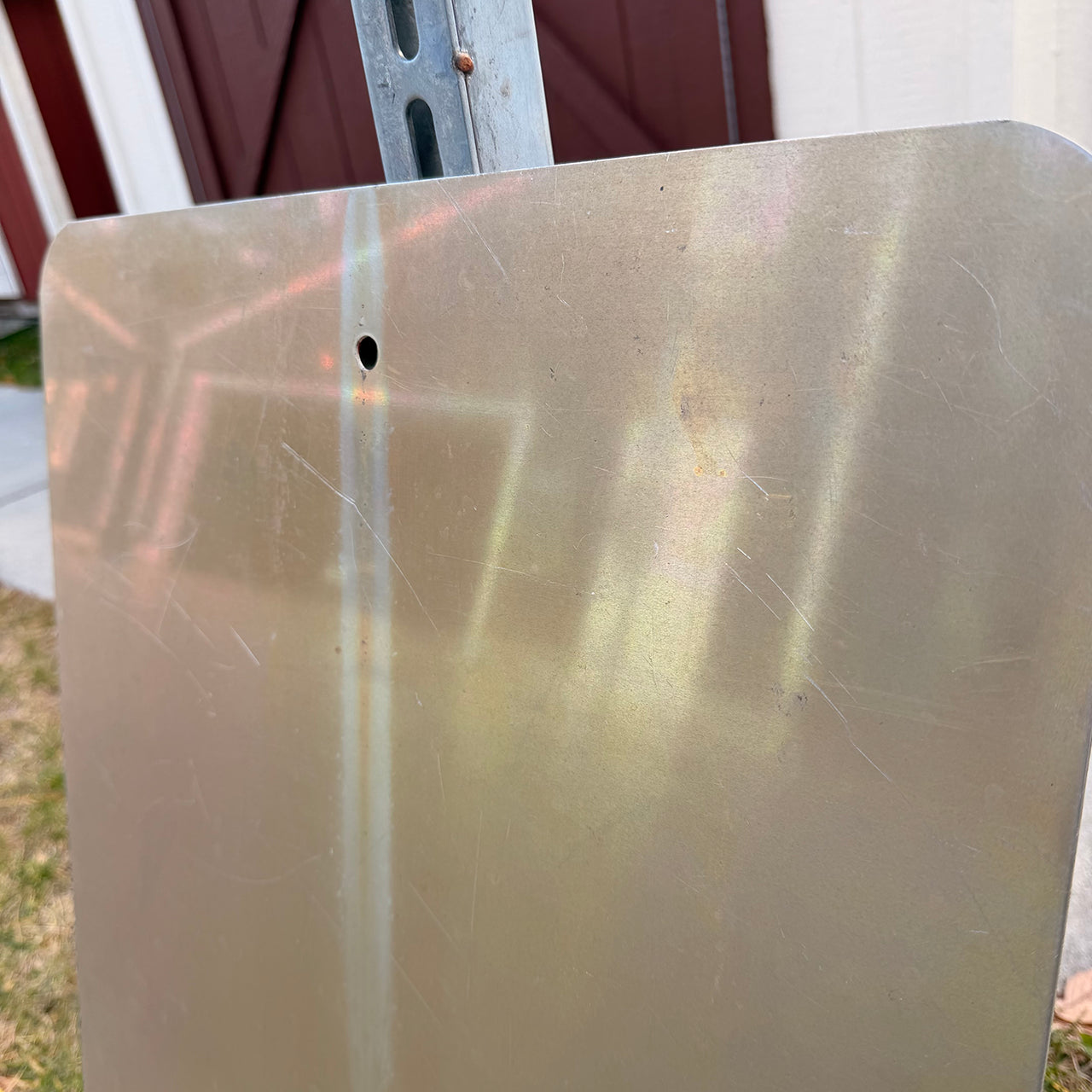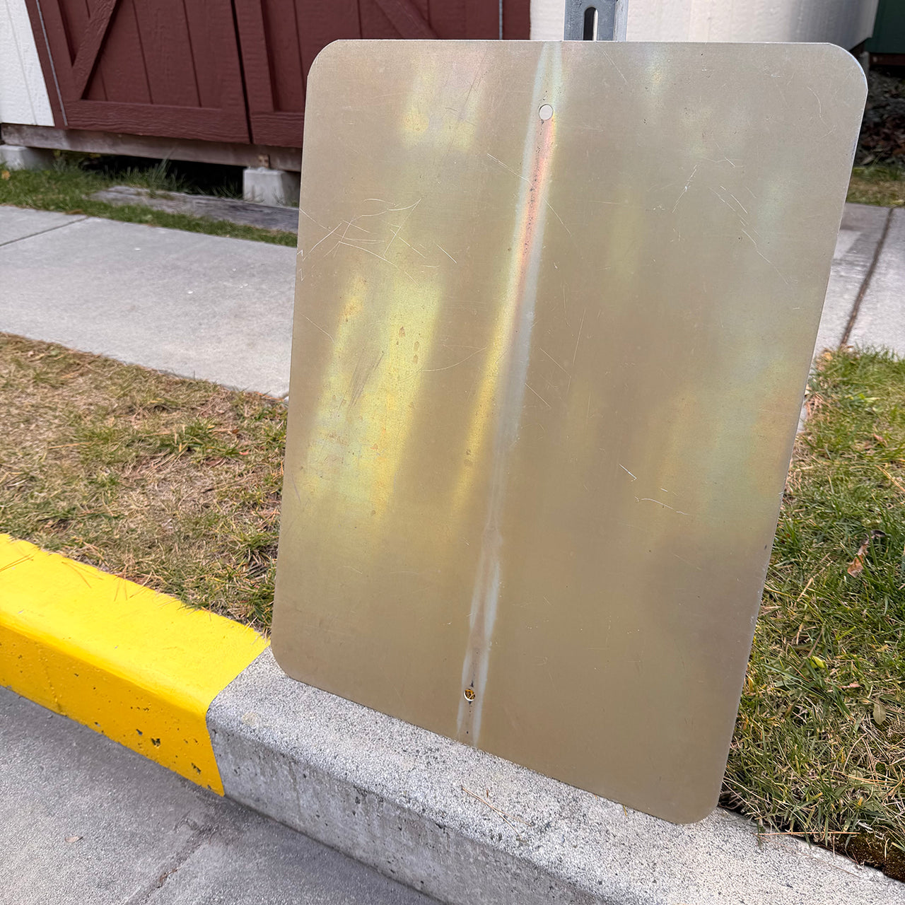現地で直接買い付けた一点物で、使用感や小傷が歴史を物語る証拠となり、レプリカでは味わえない本物の質感と存在感を楽しめます。裏面は無地ですが、設置時の支柱跡が残っており、実際に道路で使われていた証を感じられます。