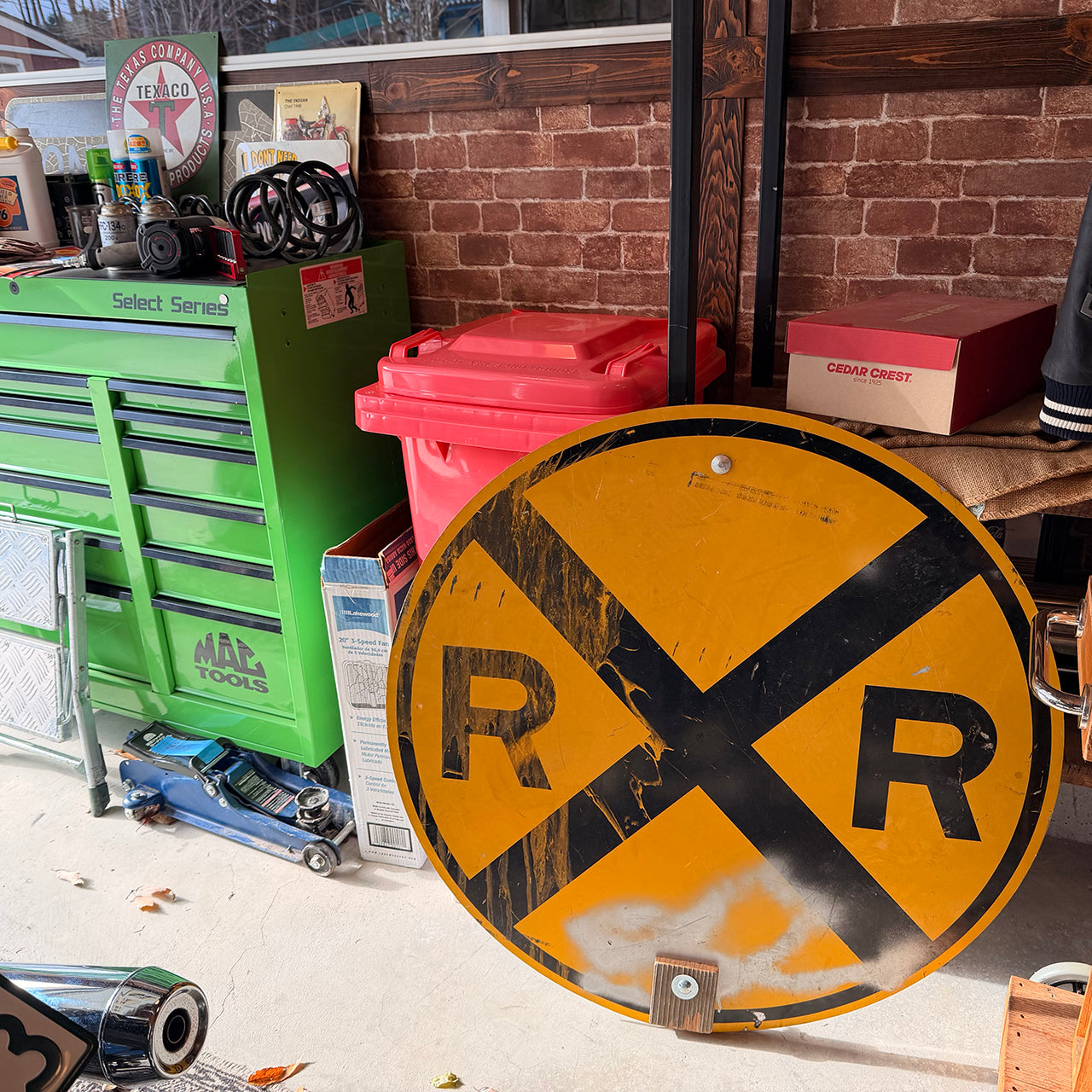 アメリカで実際に使用されていた本物のロードサイン「RR」。鉄道踏切を示す標識で、線路のある道路に設置されていたリアルなアイテムです。直径915mmのラウンド型で、ガレージやショップ、カフェのディスプレイに圧倒的な存在感を与えます。