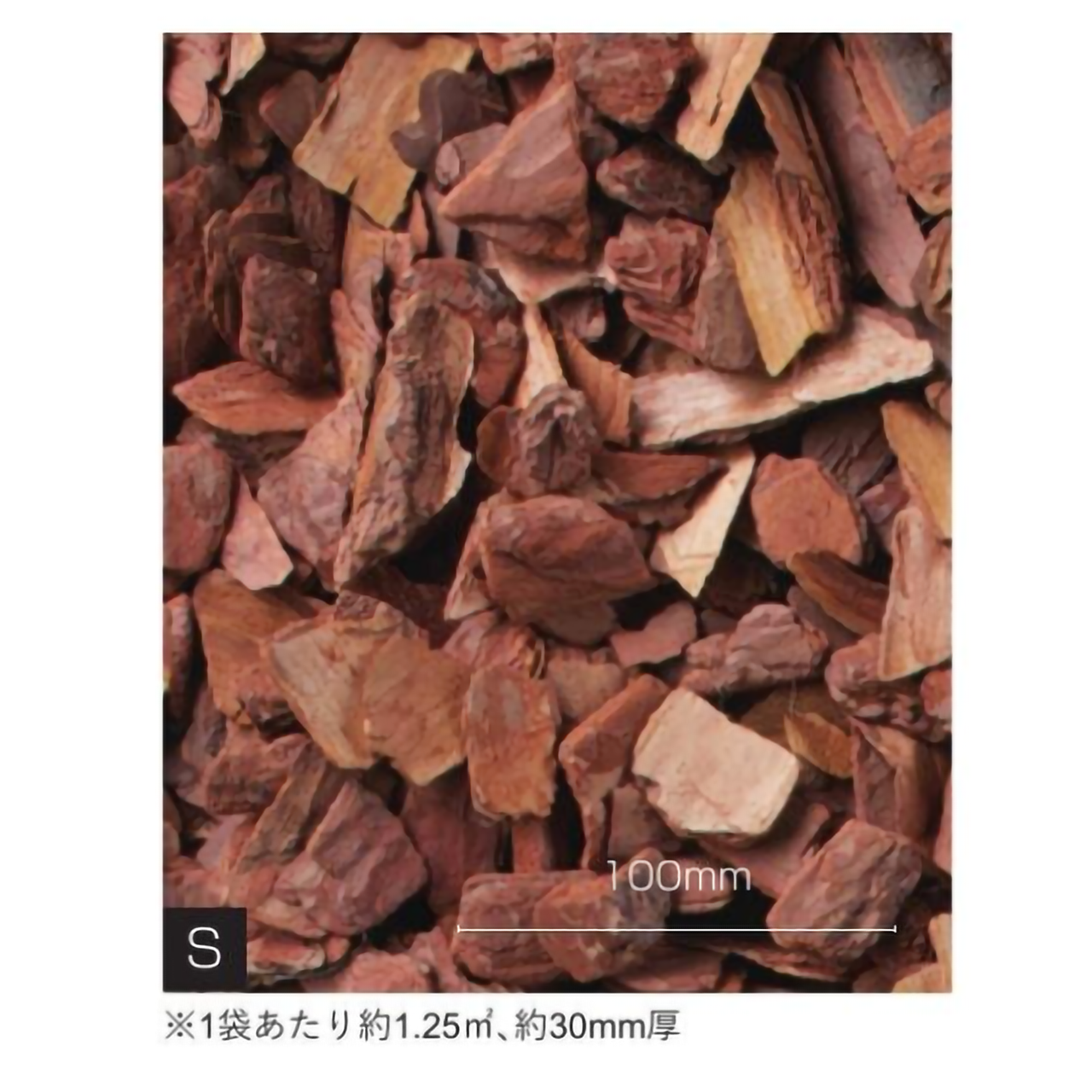 このウッドチップは、SサイズとMサイズの2種類があり、用途や空間のスケールに応じて選べるのが魅力です。どちらも厚さ30mmで敷いた場合、約1.25㎡をカバーできるため、面積の計算も簡単で施工計画が立てやすくなっています。